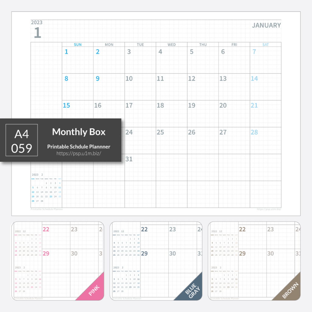 A4サイズ横使いの月間ボックス。日曜日はじまり、左端に前月、翌月のミニカレンダーを配置してあります。同じフォーマットの月曜日はじまりは、A4_022 Monthly Box Plannerになります。