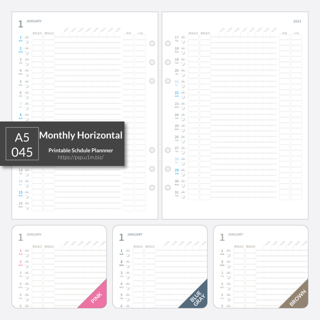 【pdf de calendar】A5_045_血圧グラフシート+体温、心拍[A5,LR,M/H]