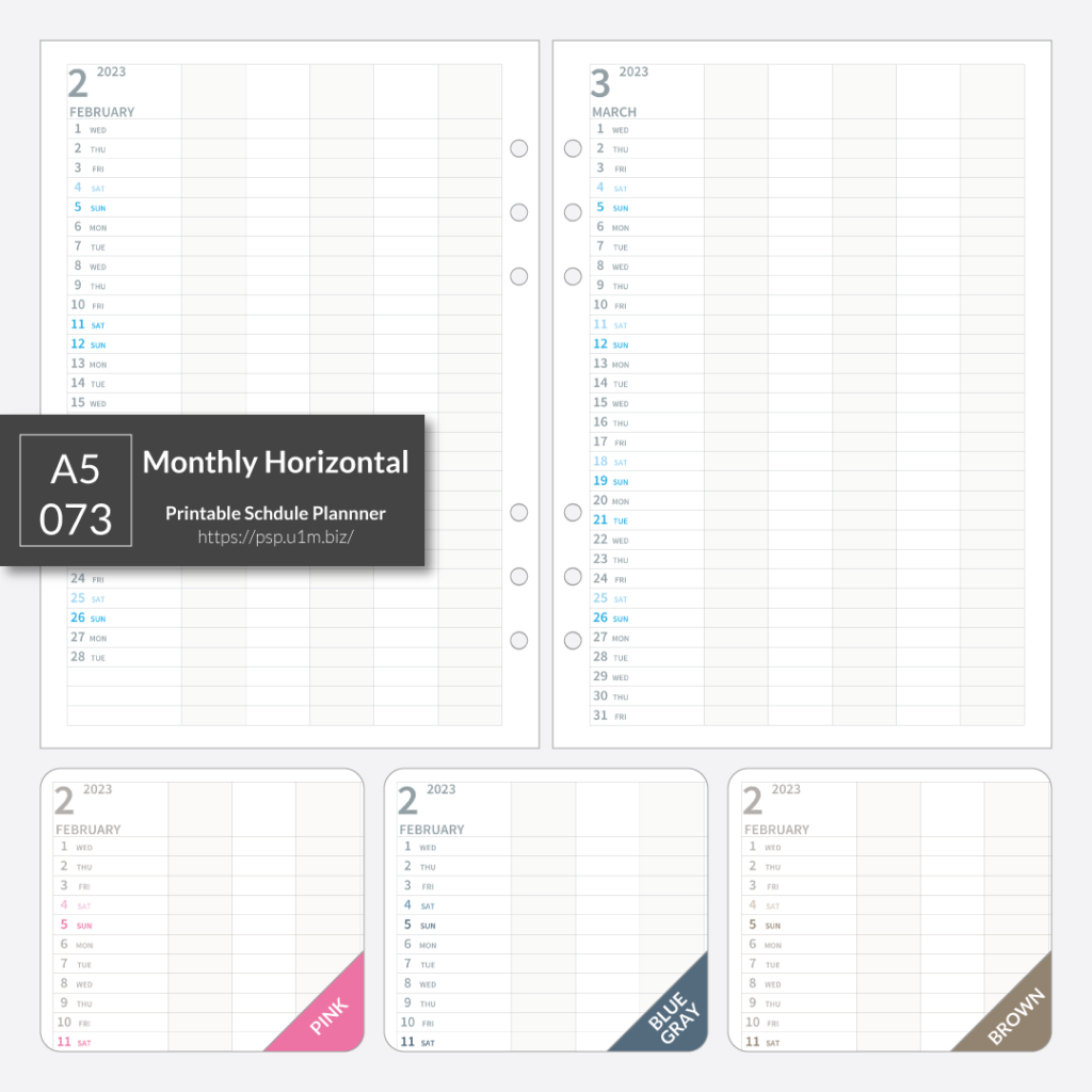 【pdf de calendar】A5_073_月間ホリゾンタル(6分割)[A5,RL,M/H]