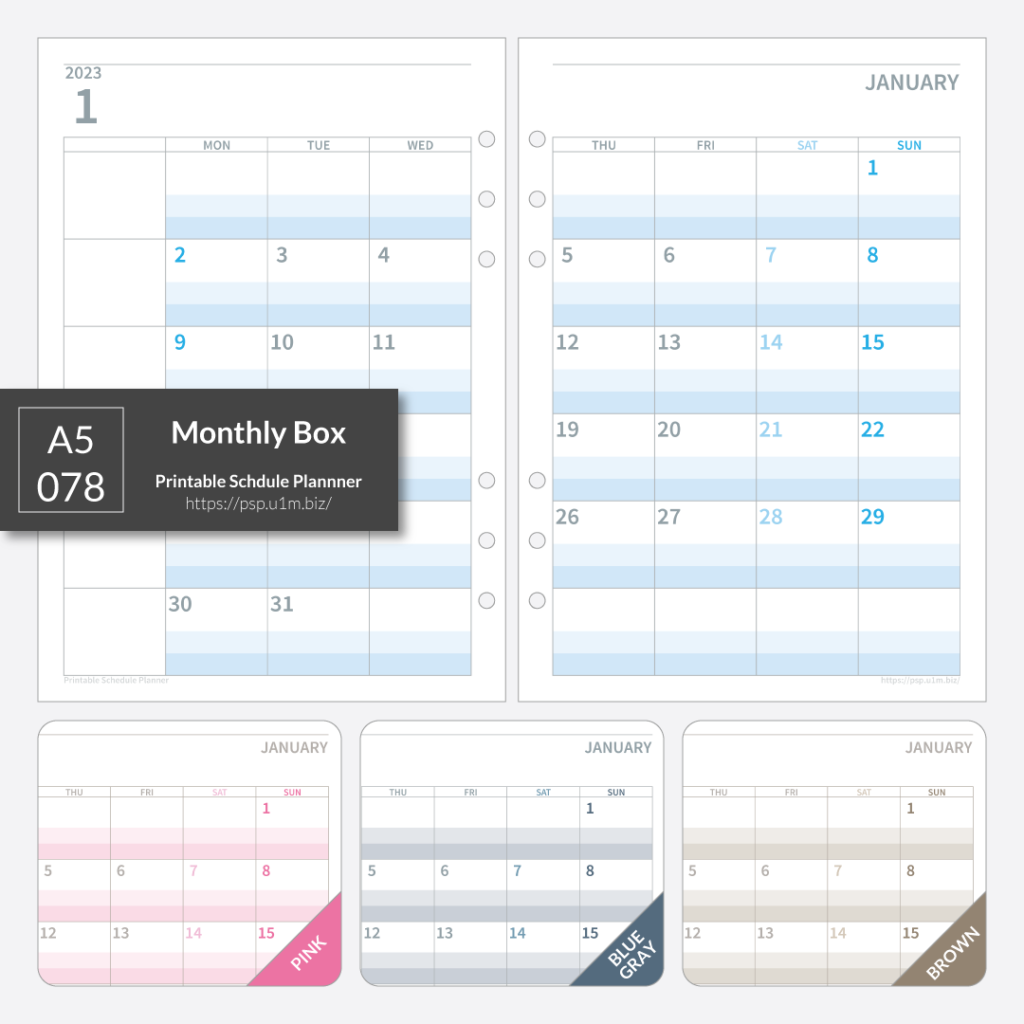 【pdf de calendar】A5_078_月間ボックス(横3行)[A5,LR,M/B,Mon]
