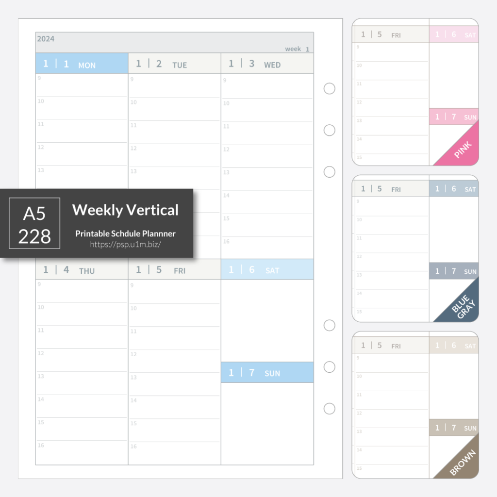 A5_228 Weekly Vertical Planner u1m 1年前 【pdf de calendar】 A5_228_週間バーティカル(2段)[A5,L,W/V,Mon,T9-16] A5サイズ、左側ページの週間バーティカル。2段組で上段に月曜〜水曜日、下段に木曜〜日曜日を配置、土日のスペースは小さめとなっています。 2024年版 A5_228_cy_2024ダウンロード A5_228_pi_2024ダウンロード A5_228_bg_2024ダウンロード A5_228_br_2024ダウンロード
