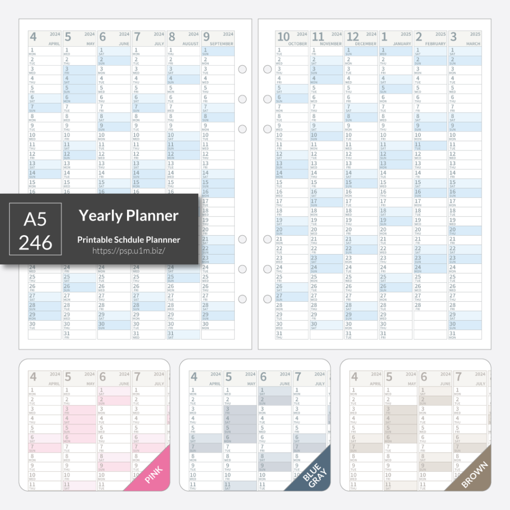 A5_033 Yearly Plannerは、1枚の表裏で1年分、A5_246は見開きで1年分のリフィルです。