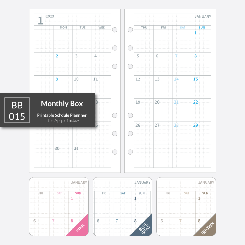 バイブルサイズ、月曜日はじまりの見開き1ヶ月の月間ボックスタイプのリフィルです。左側のページから両面に印刷してご利用ください。