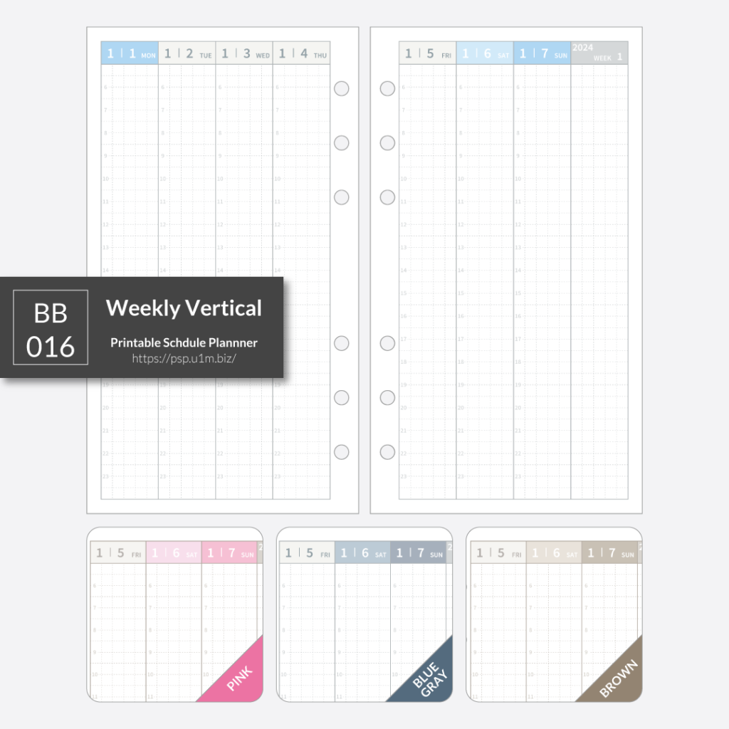 BB_016 Weekly Vertical Planner u1m 2年前 【pdf de calendar】BB_016_週間バーティカル[BB,LR,W/V,Mon,T6-23] バイブルサイズ、見開き1週間の週間バーティカル。6-23時の時間軸、左側のページに月曜〜木曜日、右側ページに金曜〜日曜とメモ欄をレイアウトしてあります。 2024年版 BB_016_cy_2024ダウンロード BB_016_pi_2024ダウンロード BB_016_bg_2024ダウンロード BB_016_br_2024ダウンロード