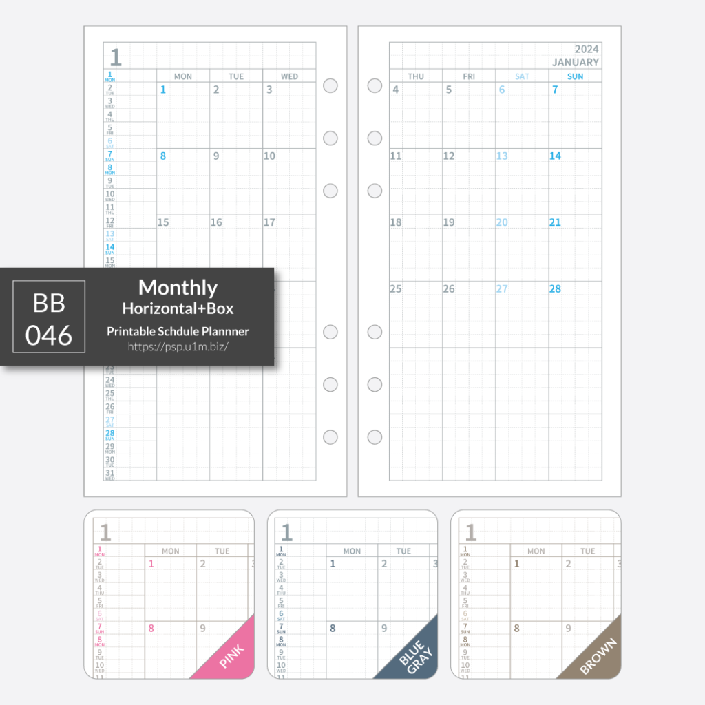 BB_046 Monthly Box + Horizontal u1m 2年前 【pdf de calendar】BB_046_月間ボックス&ホリゾンタル[BB,LR,M/B+H,Mon] バイブルサイズ、月曜日はじまりの月間ボックスと左端に月間ホリゾンタルをレイアウトしたリフィルです。 2024年版 BB_046_cy_2024ダウンロード BB_046_pi_2024ダウンロード BB_046_bg_2024ダウンロード BB_046_br_2024ダウンロード