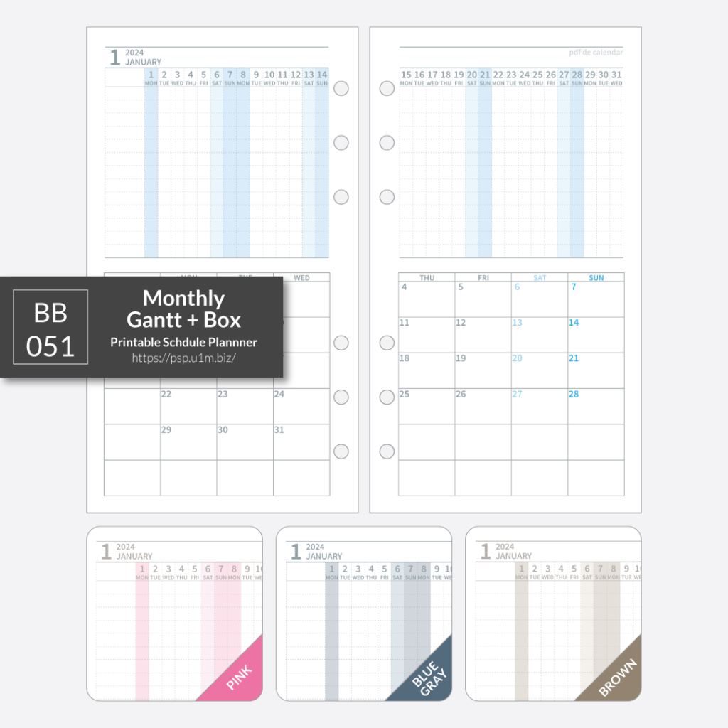BB_051 Monthly Gannt + Box Planner u1m 2年前 【pdf de calendar】BB_051_月間ガントチャート+ボック[BB,LR,MG+MB,Mon] バイブルサイズ見開き1ヶ月、上段にがんとチャート、下段に月曜日はじまりの月間ボックスをレイアウトしたリフィルです。 2024年版 BB_051_cy_2024ダウンロード BB_051_pi_2024ダウンロード BB_051_bg_2024ダウンロード BB_051_br_2024ダウンロード