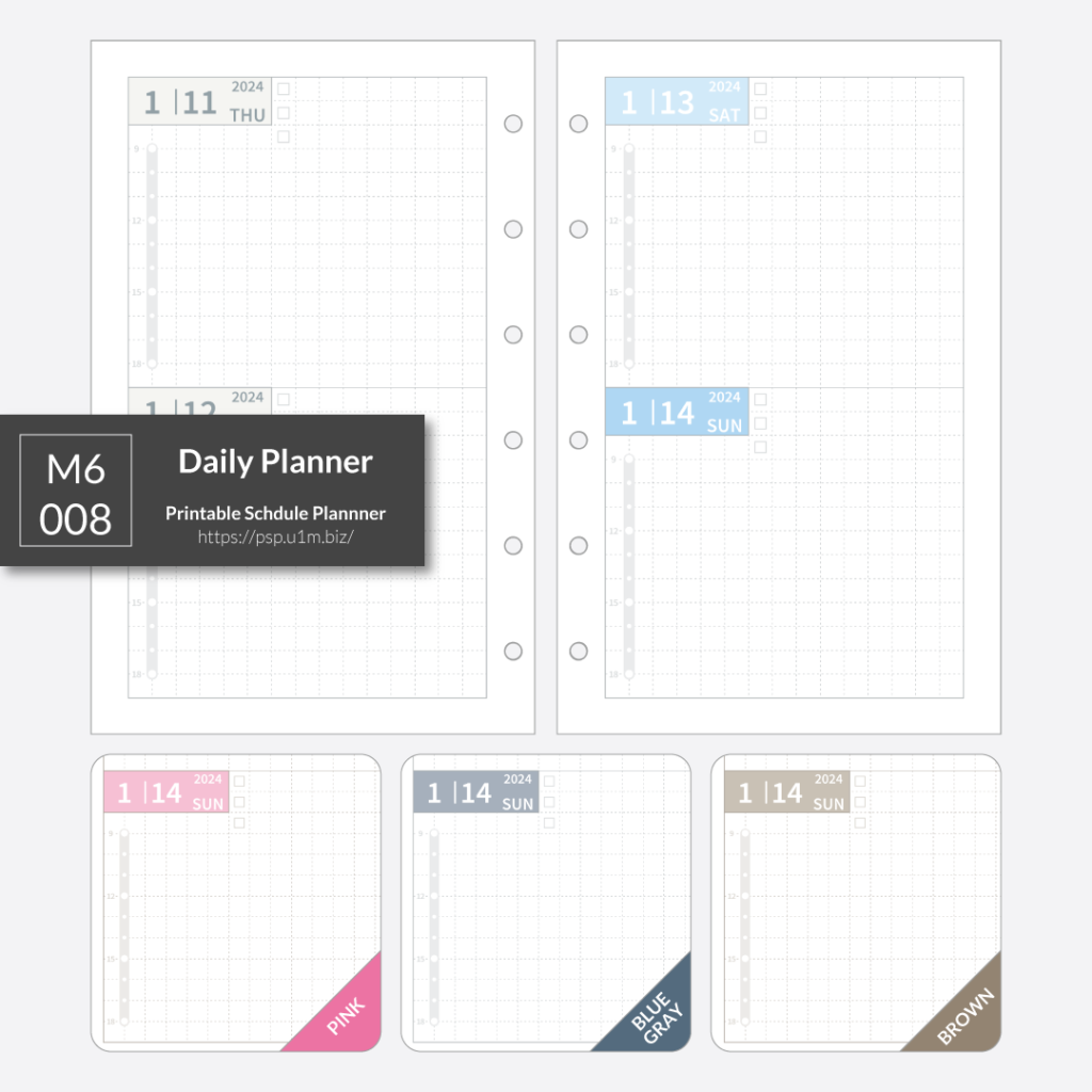ミニ6穴サイズの、2日/1ページのデイリーリフィルです。9-18時の時間軸、方眼仕様となっています。