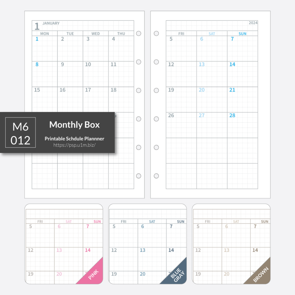 M6_012 Monthly Box Planner u1m 2年前 【pdf de calendar】 M6_012_月間ボックス(fri-sun広め)[M6,LR,M/B,Mon] ミニ6穴サイズ、見開き1ヶ月の月間ボックスタイプ。左側のページに月曜〜木曜、右側のページに金曜〜日曜日を配置、金曜日〜日曜日の幅が広めになっています。 2024年版 M6_012_cy_2024ダウンロード M6_012_pi_2024ダウンロード M6_012_bg_2024ダウンロード M6_012_br_2024ダウンロード