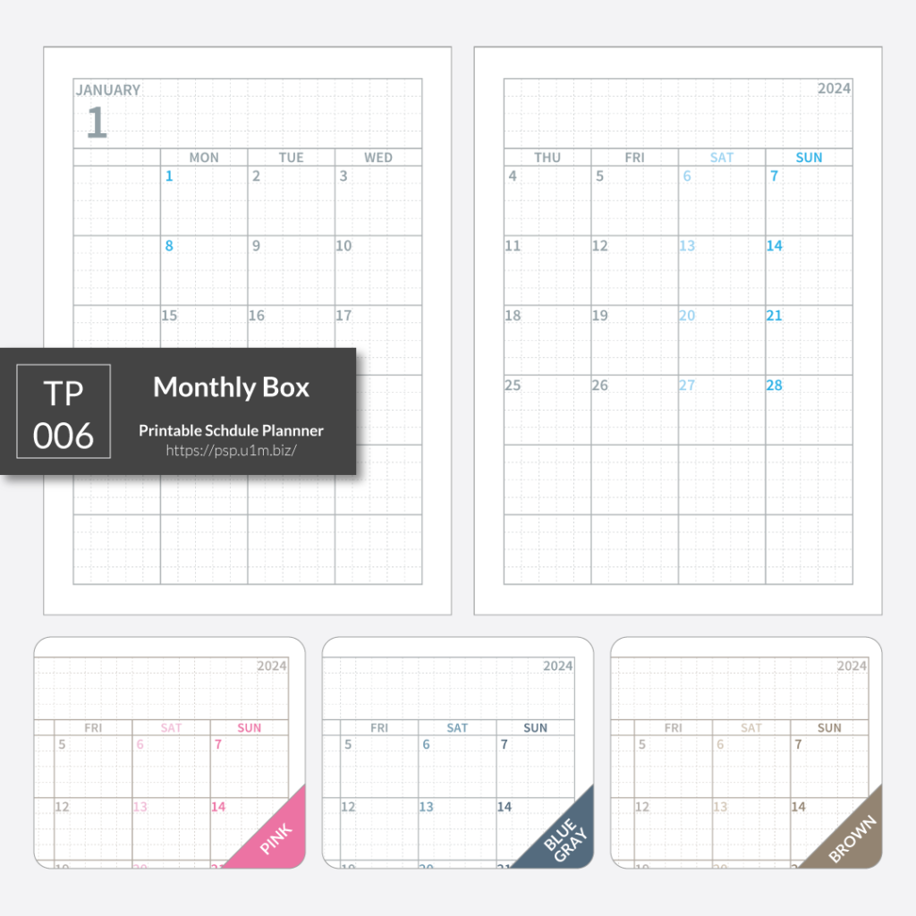 【pdf de calendar】TP_006_月間ボックス(見開き1ヶ月)[TP,LR,M/B,Mon]