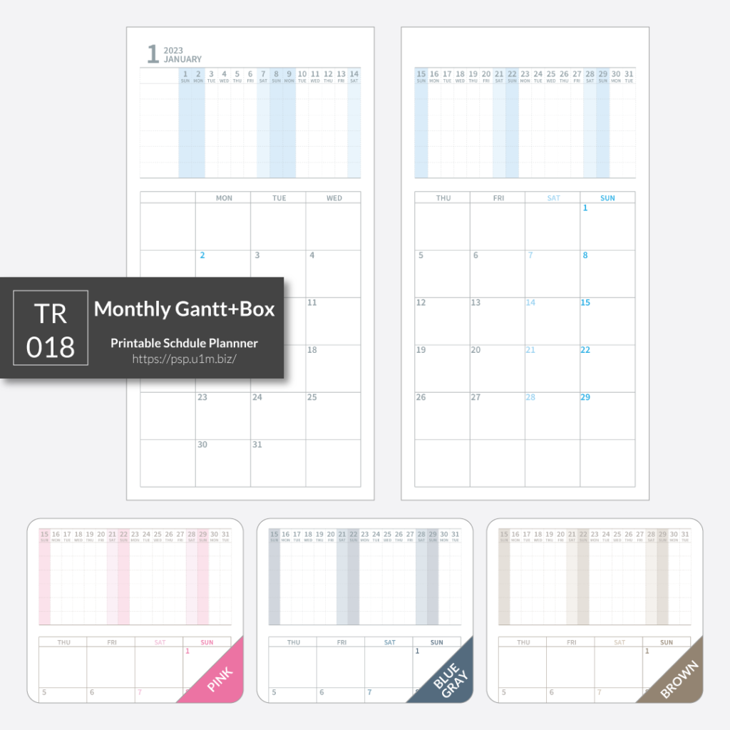 【pdf de calendar】TR_018_月間ガントチャート+ボックス[TR,MG+MB,Mon]